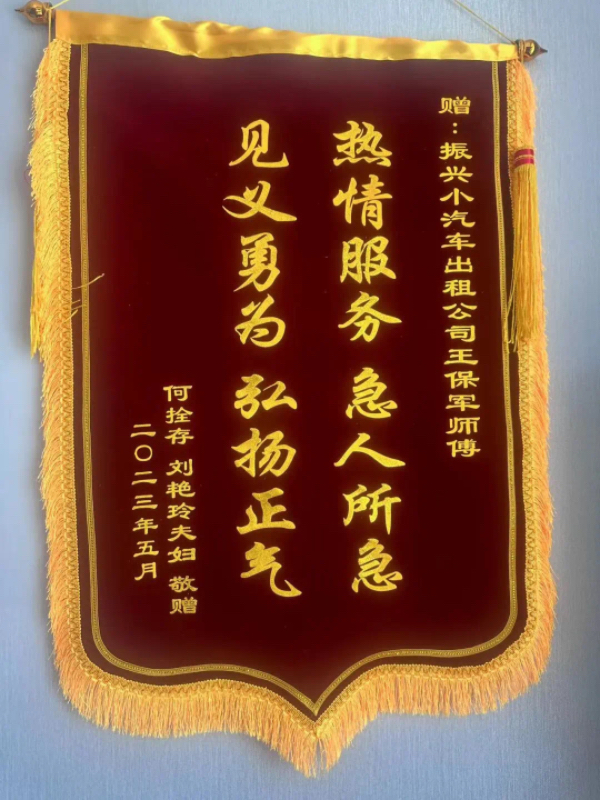 2023年5月23日,振興出租公司收到了何拴存、劉艷玲夫婦送來(lái)一面錦旗,贊許甘L82644車輛駕駛員王保軍師傅“熱情服務(wù) 急人所急 見(jiàn)義勇為 弘揚(yáng)正氣”。
